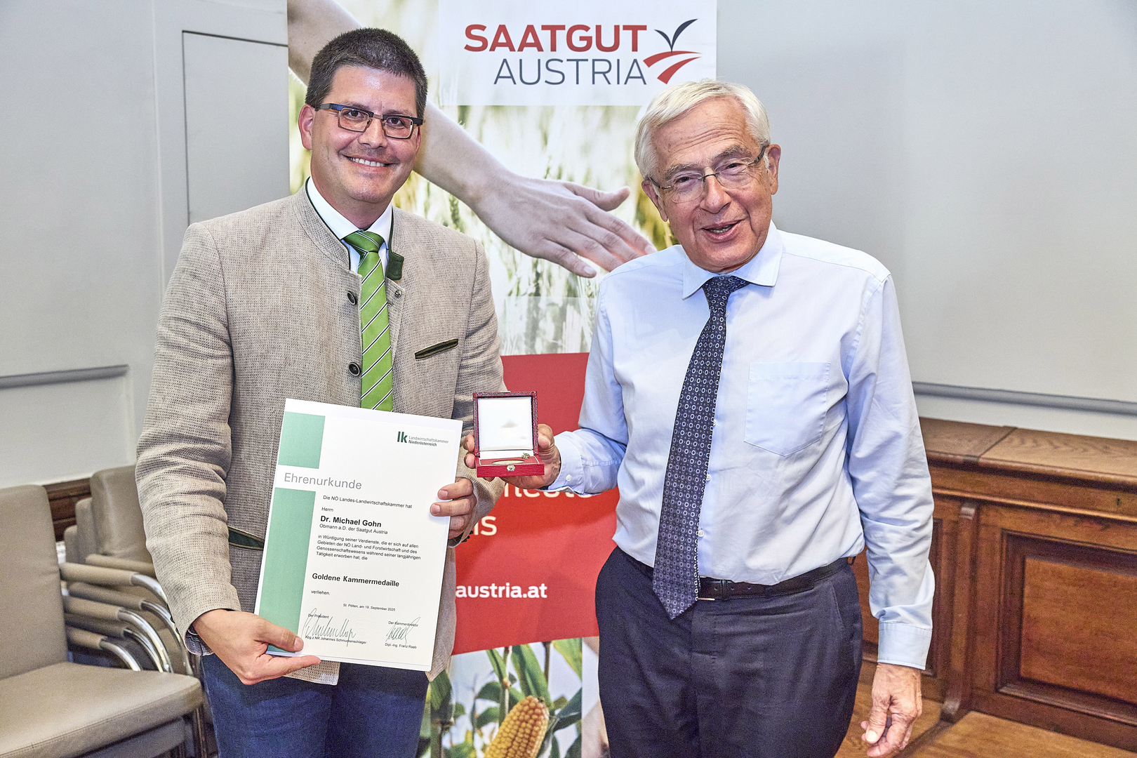 Lorenz Mayr, Vizepräsident der LK Niederösterreich, würdigte das Engagement und die Erfolge von Michael Gohn als Obmann der Vereinigung der Pflanzenzüchter und der Saatgutwirtschaft: „Michael Gohn hat die Herausforderungen der Branche erkannt und viele wichtige Neuerungen und Reformen eingeleitet. Saatgut Austria ist heute ein schlagkräftiger Verband, der sich agrarpolitisch intensiv einbringt, ein verlässlicher und konstruktiver Gesprächspartner ist und mit diversen Partnern wichtige Kooperationsprojekte auf den Weg gebracht hat. Ein Beispiel dafür ist das Projekt Klimafit, das Saatgut Austria gemeinsam mit dem Bundesministerium für Land- und Forstwirtschaft (BMLUK), den Bundesländern und der AGES durchführt und das international einzigartig und höchst erfolgreich ist. Er hat zudem erkannt, dass es eine professionelle Kommunikation braucht, um die Forderungen und Vorhaben der Branche durch- und umzusetzen.“ Für seine Verdienste für die Land- und Forstwirtschaft sowie das Genossenschaftswesen zeichnete Lorenz Mayr Michael Gohn mit der Goldenen Kammermedaille aus.